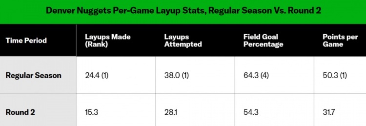 (图为掘金常规赛和季后赛次轮篮下的场均命中数、出手数、命中率和得分对比)