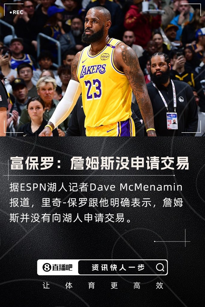 “勒布朗-詹姆斯的经纪人里奇-保罗跟我说,有4支球队联系了他,表示有兴趣交易得到勒布朗,”Dave McMenamin说道,“(里奇)保罗也向我明确表示,勒布朗并没有申请交易,(里奇)保罗甚至没有和湖人讨论过未来想要交易的可能性。”