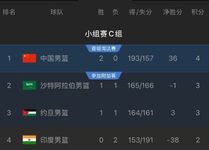 目前中国男篮所在的C组排名如下: