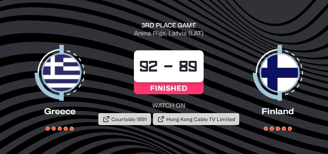 差点就被逆转了!希腊拒绝翻盘三分险胜芬兰 夺得欧锦赛季军!