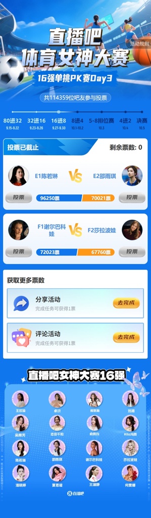 直播吧女神大赛16强赛Day3赛果:陈若琳淘汰邵雨琪 千金击败莎娃