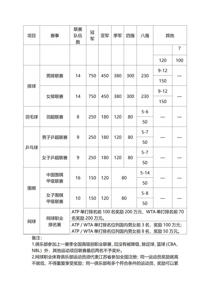 07月27日讯 江苏省体育局发布《江苏省职业体育俱乐部奖补标准》,俱乐部根据上一赛季参加的全国高级别职业联赛成绩申请奖补资金。