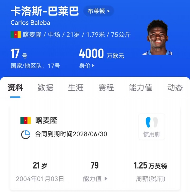 巴莱巴与布莱顿的现有合同2028年到期,另有一年续约选项,球员目前的德转身价为4000万欧元。此前有报道称布莱顿对巴莱巴的估价高达1亿英镑。