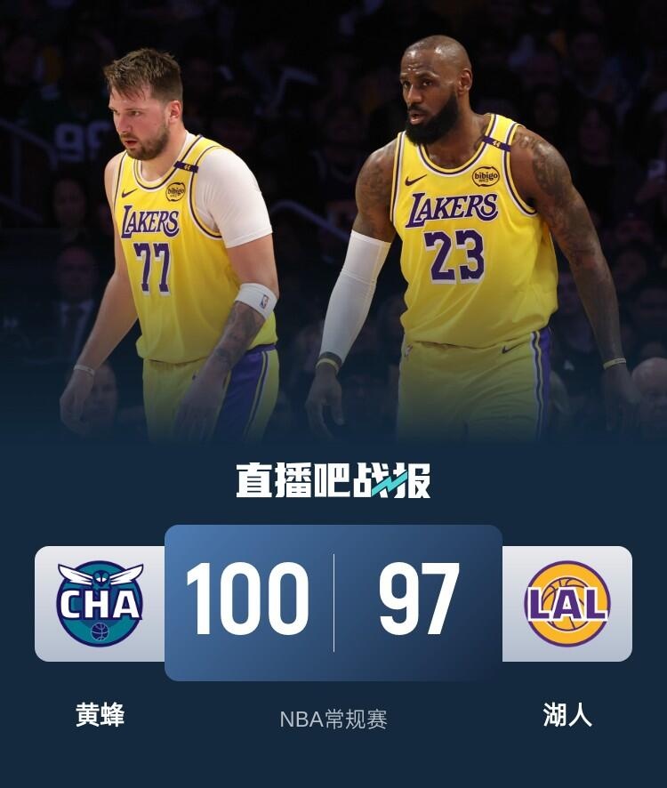 比赛开始,詹姆斯接连三分包办湖人前8分,东契奇进攻端不在状态,且半节就出现5次失误,好在黄蜂外线始终没有手感,詹姆斯带队接连外线发炮首节领先7分,次节双方继续在场上打铁乱战,进攻端手感都很一般,东契奇和詹姆斯轮番送助攻带队半场领先到11分。下半场,东契奇手感还是不佳,三球接连三分带队追分,里夫斯抱怨裁判被驱逐,黄蜂连续外线发炮打出17-1攻击波直接反超3分,末节三球2记三分扩大领先,詹姆斯里突外投连砍11分紧急止血,湖人轰出12-2攻击波反超比分,双方进入白热化,东契奇补篮反超后尼克-史密斯三分反超回来,八村塁关键两罚不中,三球挑篮领先4分,詹姆斯三分续命,但接连追平三分不中,最终湖人97-100惜败黄蜂。