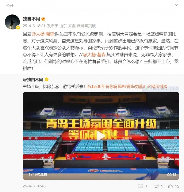 4月3日讯 今天,青岛男篮记者杜金城在社媒上谈到了球队的情况。