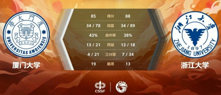 加时赛,刘粤韬中投先拔头筹,刘振宇罚球追平比分,丁小峰突破上篮打进,贾亦杰外线三分中的,此后厦门大学依旧努力追分,刘振宇投进高难度打板三分续命,浙江大学后场8秒违例,但厦门大学也未能把握住机会,最终浙江大学加时88-85力克厦门大学。