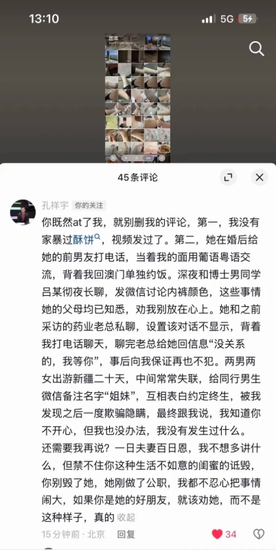 随后,还有女方的闺蜜在社媒上晒出家暴痕迹的照片并@孔祥宇,孔祥宇在评论区直接留言回应:“你既然at了我,就别删我的评论,第一,我没有家暴过酥饼,视频发过了。