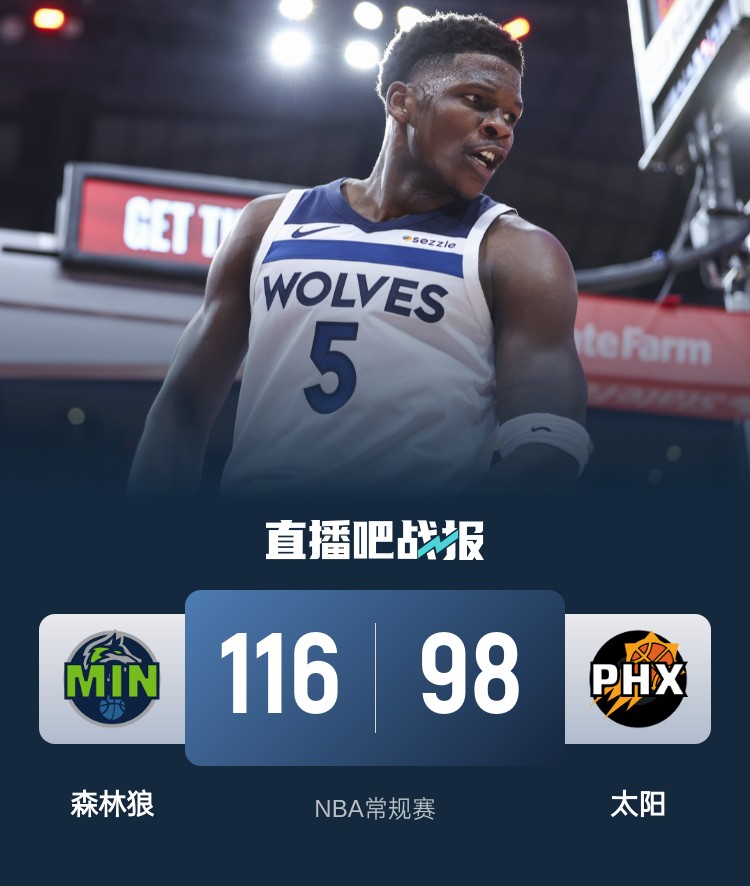爱德华兹解禁44+5+7 兰德尔复出20+6 KD26+10 森林狼三杀太阳