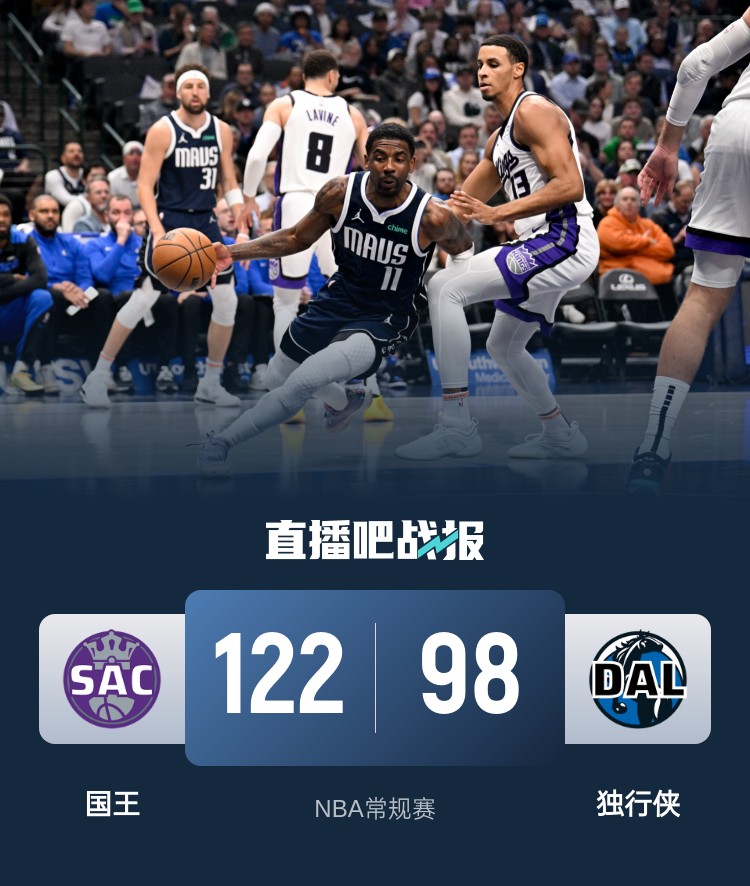 一开场,国王反客为主率先发力,打出15-7的开局,独行侠不断冲击内线努力追赶,欧文左膝受伤但坚持罚完2球后才退出比赛,次节独行侠命中率骤降,国王连投带罚轻松将分差拉开到两位数,克莱三分止血,国王持续发力重获两位数优势,半场战罢国王60-50领先独行侠。下半场,独行侠再度哑火,国王多点开花单节净胜18分一度将分差拉开到30分,末节国王稳扎稳打保持优势,独行侠大势已去无力回天。最终,国王122-98大胜独行侠,客场过关。