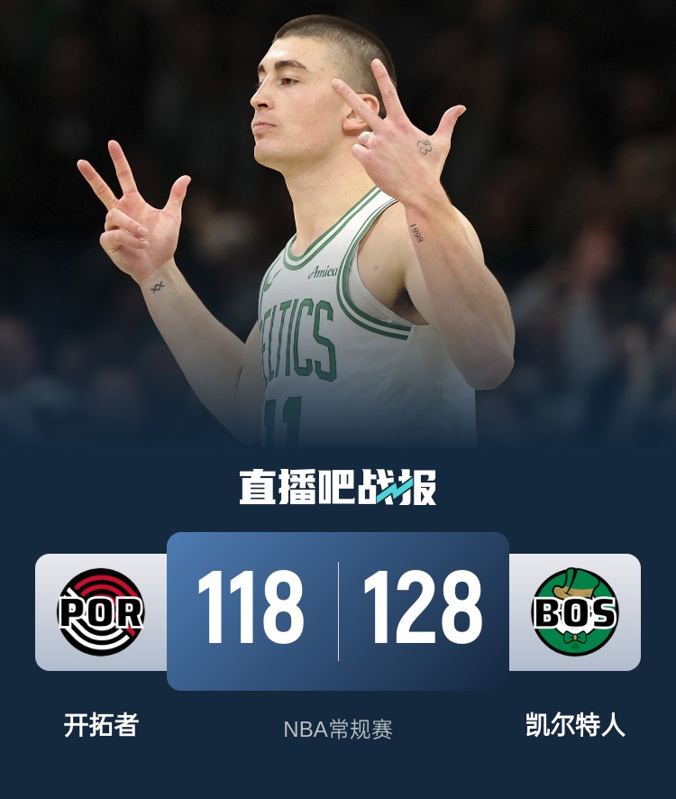 开场后两队打得十分激烈,场上比分也是交替上升,普里查德替补登场后手感火热连中三分,不过亨德森不逞多让连续砍分回应,但凯尔特人外线火力凶猛以5分优势结束首节。第二节上来凯尔特人外线手感依旧火热,不断下起三分雨,开拓者进攻状态也是火热,能够及时回应咬住比分,布朗补篮打进帮助凯尔特人在半场结束时将分差拉大到两位数。易边再战,凯尔特人外线手感火热,怀特和普理查德又是轮番三分轰进,开拓者虽然进攻手感不错但完全挡不住凯尔特人的狂轰乱炸,凯尔特人将分差拉大到20分以上,虽然最后一节开拓者也是凭借外线火力掀起反扑,一度将分差追到只差个位数,布朗抛投止血,此后凯尔特人牢牢守住优势,最终凯尔特人128-118击败开拓者取得2连胜。