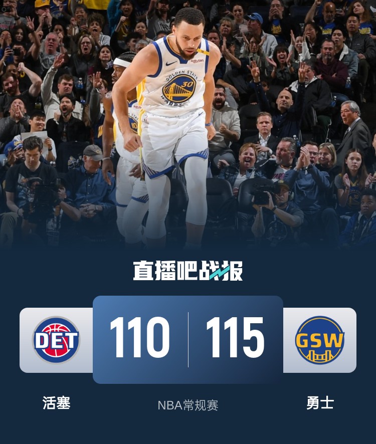比赛开始,勇士率先发力打出9-0的开局,奥萨尔暴扣引领反击,活塞轮番冲击篮筐连投带罚不断蚕食分差,次节斯图尔特打成2+1帮助球队反超,此后双方陷入缠斗,比分始终紧咬,活塞继续频频杀伤,勇士内外开花给出回应,半场战罢勇士51-54落后活塞。易边再战,库里用一记三分拿到生涯第2万5千分,比斯利连得5分,双方依旧打得难分伯仲,末节两端争夺陷入白热化,关键时刻康宁汉姆上篮得手,追梦连投带罚拿到4分,比斯利绝平三分不中,库里罚球杀死比赛。最终,勇士115-110力克活塞,取得4连胜。