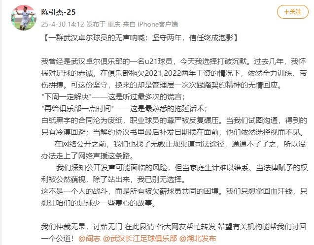 4月30日讯 今日,一名名叫“陈引杰-25”的博主在社媒发文,他自称是前武汉卓尔青训球员,代表部分球员群体向前俱乐部及卓尔集团董事长阎志讨薪。他在社媒写道: