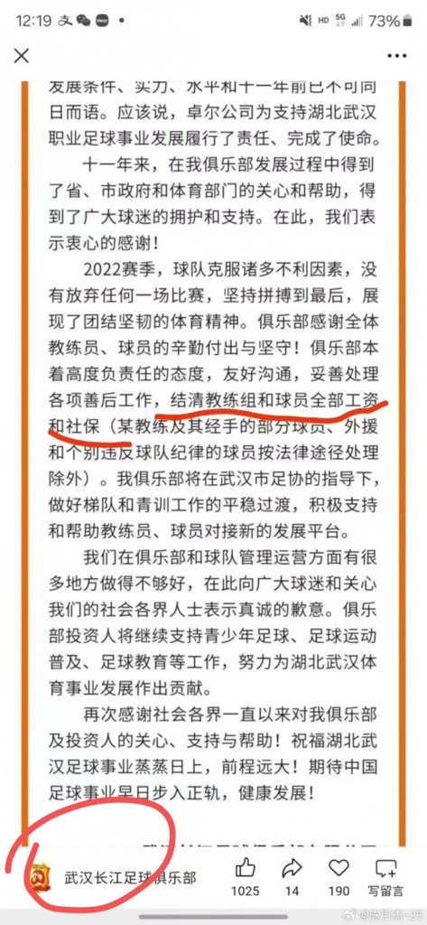 我曾经是武汉卓尔俱乐部的一名u21球员,今天我选择打破沉默。过去几年,我怀揣对足球的赤诚,在俱乐部拖欠2021,2022两年工资的情况下,依然全力训练、带伤拼搏。可这份坚守,换来的却是管理层一次次践踏契约精神的无情回应。