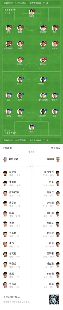 上海海港首发:1-颜骏凌、13-魏震、15-明天、32-李帅、40-吾米提江-玉苏普、6-徐新、10-马特乌斯-维塔尔(F)、22-马修斯-茹萨(F)、26-刘若钒、30-加布里埃尔(F)、45-莱昂纳多(F)