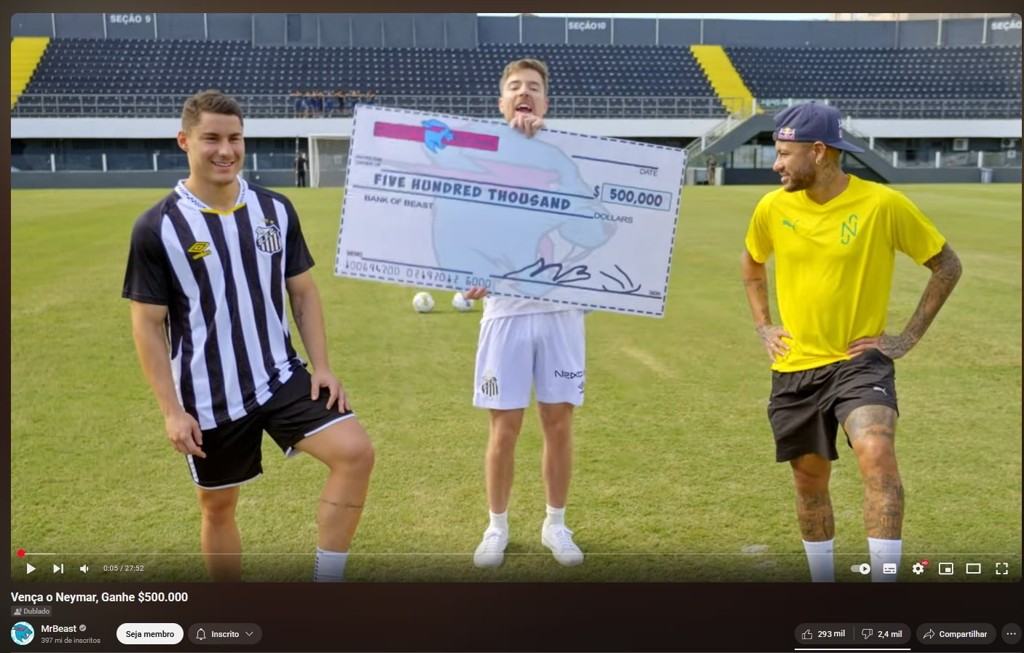 在知名网红MrBeast发起的挑战中,内马尔受邀与一名球迷在桑托斯的Vila Belmiro球场进行了一次射门挑战,胜者将有机会赢得50万美元奖金。