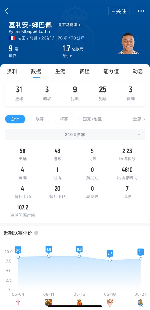 56场43球5助攻&欧洲金靴!官方:姆巴佩当选皇马赛季最佳球员