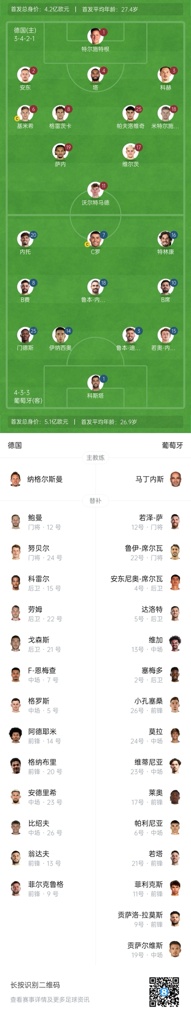 6月5日讯 欧国联A联赛半决赛,德国主场迎战葡萄牙,赛前首发名单公布。