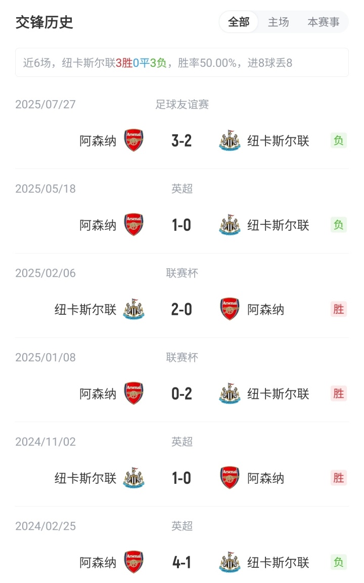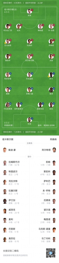 目前英超积分榜上,纽卡1胜3平1负积6分,位列第15;阿森纳3胜1平1负积10分,位列第7。