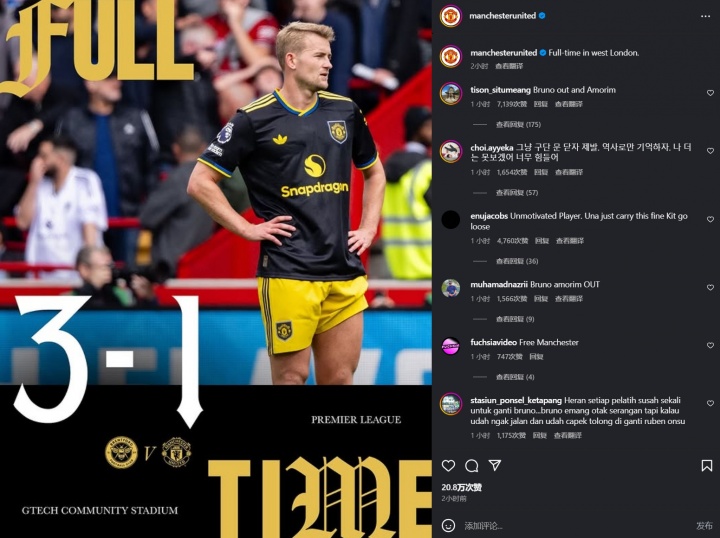 9月28日讯 曼联本轮1-3不敌布伦特福德,在上轮击败十人蓝军后,球队没能延续势头。这场失利令球迷失望透顶,这也在曼联官方社媒评论上有直观体现。