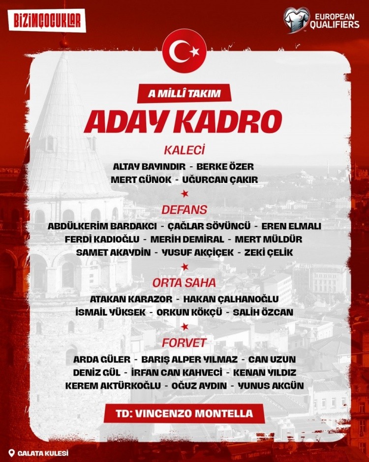 土耳其世预赛名单:恰尔汗奥卢、居勒尔、伊尔迪兹、乌尊在列