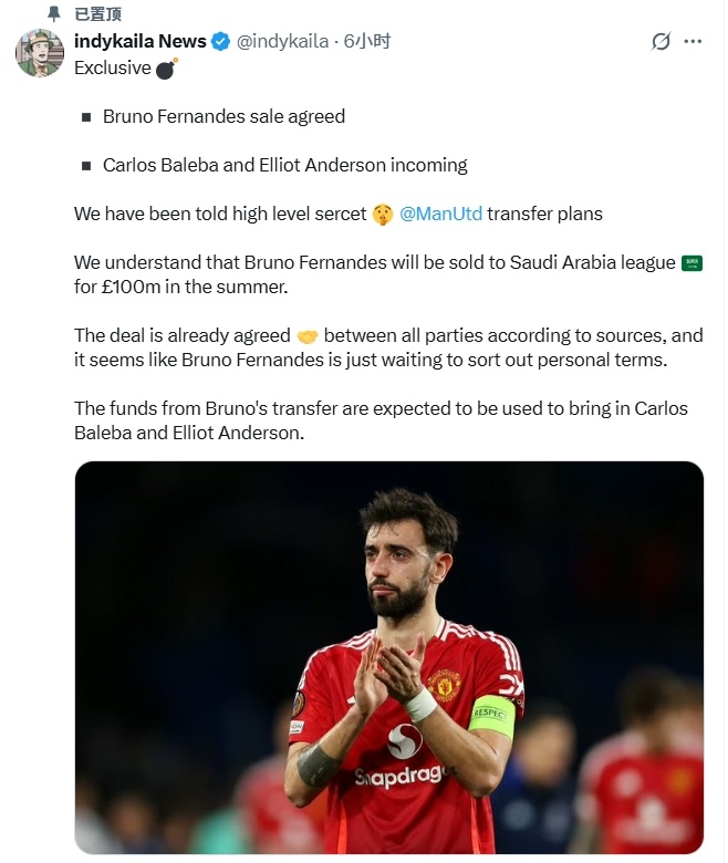 绿帽哥indykaila News独家消息,曼联将以1亿镑价格将B费卖给沙特联球队。