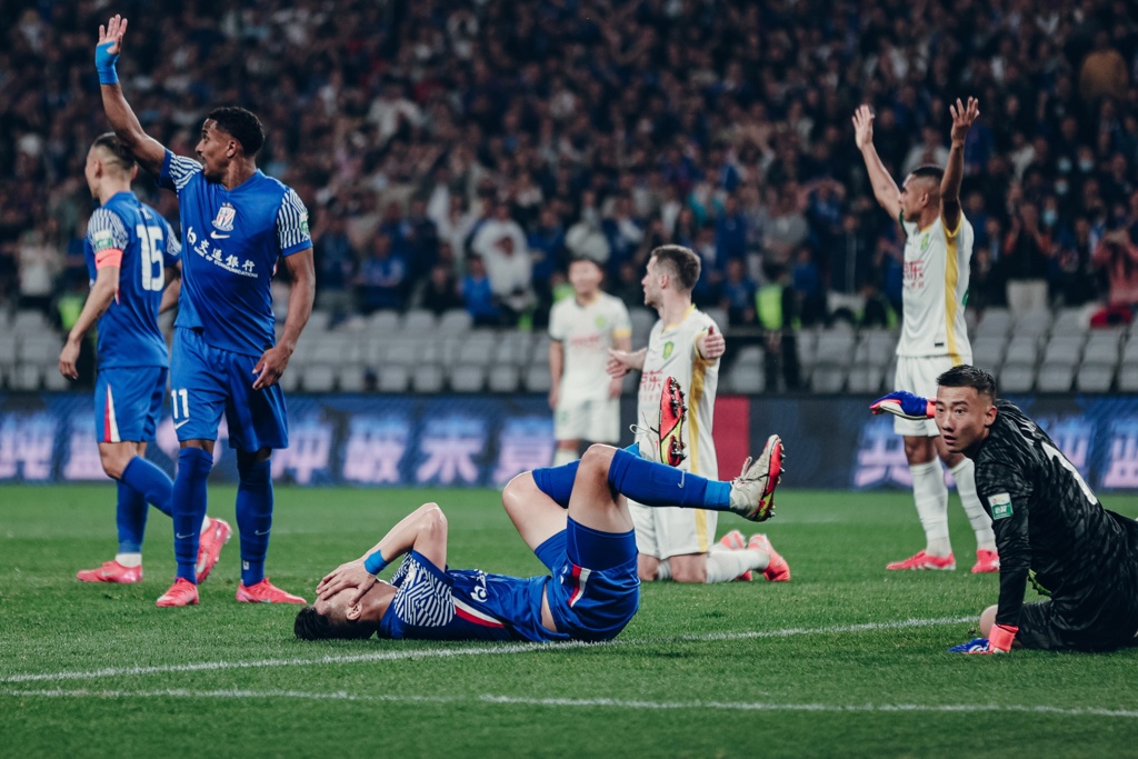 本轮中超申花2比2战平国安,上半场补时阶段,申花前场任意球,韩佳奇出击稍慢一步,拳击蒋圣龙面部,主裁麦麦提江判罚点球+韩佳奇黄牌。蒋圣龙在接受治疗后打满了全场比赛。
